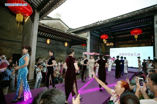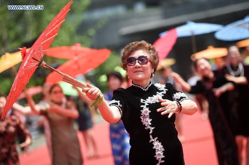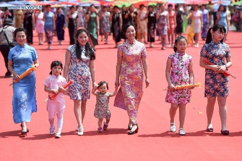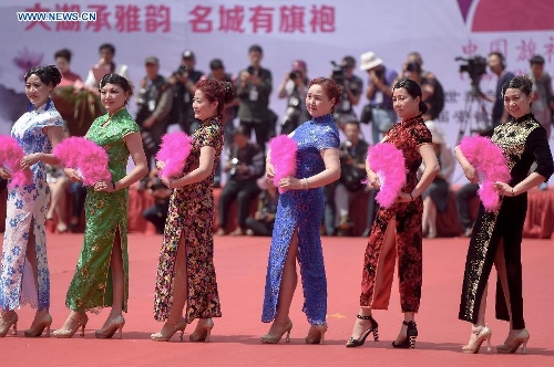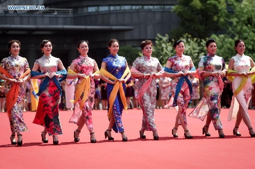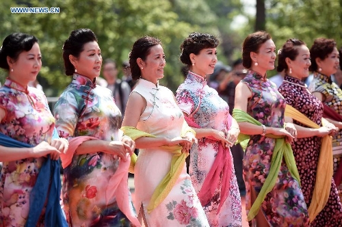 Cheongsam lovers present cheongsams, a traditional Chinese women's dress also known as Qipao, during a cheongsam show in Hefei, capital of east China's Anhui Province, May 16, 2015. Sponsored by China Qipao Society, a worldwide cheongsam show was held Saturday, with the participation of some 150,000 cheongsam lovers from 420 branches of China Qipao Society around the world. (Xinhua/Zhang Duan)