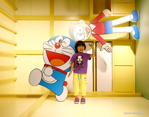A girl poses for photos with figures of Doraemon and Nobita Nobi during an exhibition of the 45th anniversary of Japanese manga series Doraemon at a shopping mall in Beijing, capital of China, June 1, 2015. The exhibition will last for three months. (Xinhua/Chen Jianli)