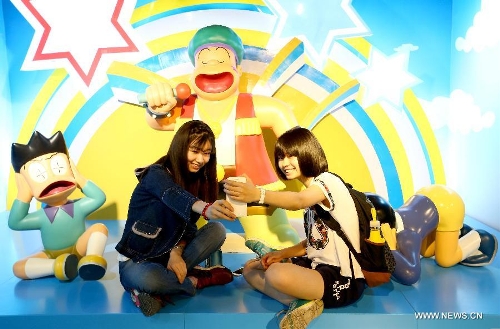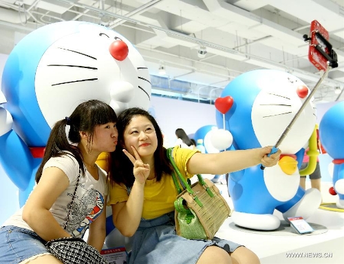Girls take selfies with figures of Doraemon during an exhibition of the 45th anniversary of Japanese manga series Doraemon at a shopping mall in Beijing, capital of China, June 1, 2015. The exhibition will last for three months. (Xinhua/Chen Jianli)