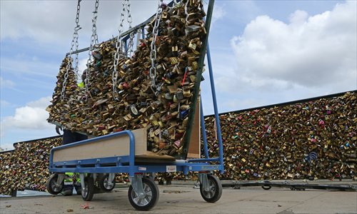 A worker removes locks from the Pont des Arts bridge in Paris, France, on Monday. After an extended debate, French officials began removing the locks, attached by tourists as a symbol of love, due to the risk the weight of the locks poses to the structural integrity of the bridge. Photo: IC