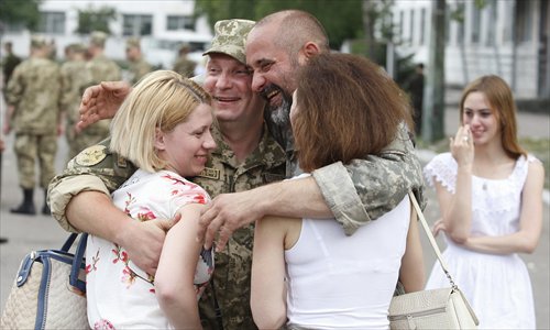 Ukrainian servicemen hug relatives in the Ukrainian city of Vasylkiv on Thursday during a ceremony for soldiers on duty in the region of Donetsk. Photo: AFP