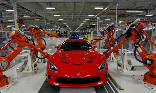 Robots inspect a Dodge Viper on the production line at a Fiat Chrysler Automobiles assembly plant in Detroit, the US on May 8. Photo: CFP