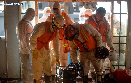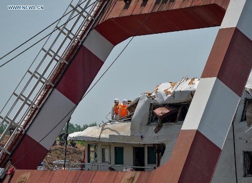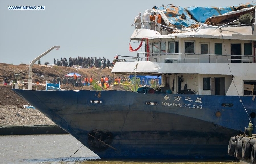 Rescuers work in the hull of the upright ship Eastern Star in an effort to search for the missing in the section of Jianli on the Yangtze River, central China's Hubei Province, June 6, 2015. The death toll from the sinking climbed to 406. Photo: Xinhua