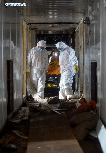 Rescuers carry the body of a victim in the hull of the upright ship Eastern Star in the section of Jianli on the Yangtze River, central China's Hubei Province, June 6, 2015. The death toll from the sinking climbed to 406. Photo: Xinhua