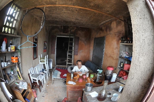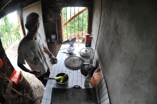 Xu Wenyi cleans the kitchen of his cave house in Xiangtan County, central China's Hunan Province, June 10, 2015. Xu Wenyi, 57 years old, digged a cave for living on a hill in Xiangtan County after divorce. Measured three to four meters in width and about 30 meters in depth, the cave, which he called the "Xiyan Cave", cost him six years for digging and now he has lived in it himself for 11 years. (Xinhua/Long Hongtao)
