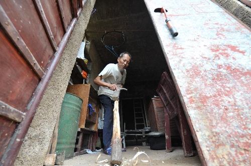 Xu Wenyi does carpenter work in his cave house in Xiangtan County, central China's Hunan Province, June 10, 2015. Xu Wenyi, 57 years old, digged a cave for living on a hill in Xiangtan County after divorce. Measured three to four meters in width and about 30 meters in depth, the cave, which he called the "Xiyan Cave", cost him six years for digging and now he has lived in it himself for 11 years. (Xinhua/Long Hongtao)