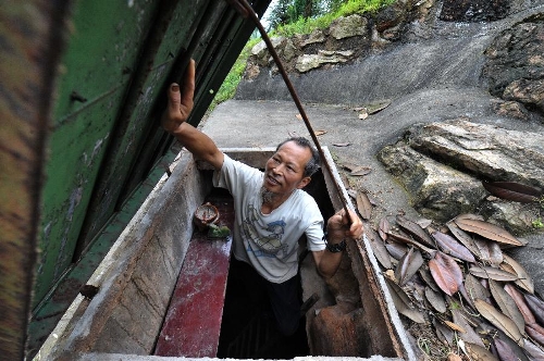 Xu Wenyi locks his cave house in Xiangtan County, central China's Hunan Province, June 10, 2015. Xu Wenyi, 57 years old, digged a cave for living on a hill in Xiangtan County after divorce. Measured three to four meters in width and about 30 meters in depth, the cave, which he called the "Xiyan Cave", cost him six years for digging and now he has lived in it himself for 11 years. (Xinhua/Long Hongtao)