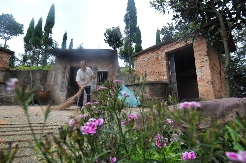 Xu Wenyi cleans the yard of his cave house in Xiangtan County, central China's Hunan Province, June 10, 2015. Xu Wenyi, 57 years old, digged a cave for living on a hill in Xiangtan County after divorce. Measured three to four meters in width and about 30 meters in depth, the cave, which he called the "Xiyan Cave", cost him six years for digging and now he has lived in it himself for 11 years. (Xinhua/Long Hongtao)
