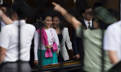Myanmar's National League for Democracy (NLD) chairperson Aung San Suu Kyi leaves the airport following her arrival in Beijing on June 10, 2015. Photo: CFP