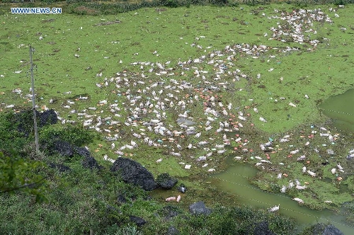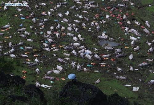 Photo taken on June 16, 2015 shows the drowned pigs at a farm in Liuye Township of Dahua Yao Autonomous County, southwest China's Guangxi Zhuang Autonomous Region. A total of 16,000 pigs drowned at the farm flooded due to heavy rainstorms. (Xinhua/Huang Xiaobang)
