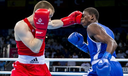 Latvia's Mihails Pavlovs (left) lands a left jab to the head of Spain's Youba Sissokho Ndiaye during the men's welterweight (69-kilogram) round of 32 bout at the 2015 European Games in Baku on Wednesday. Sissokho Ndiaye rallied to win 3-0. Photo: AFP