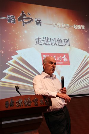 Matan Vilnai, the ambassador of Israel to China, visited Beijing Language and Culture University on Wednesday to promote reading and exchange ideas with students.