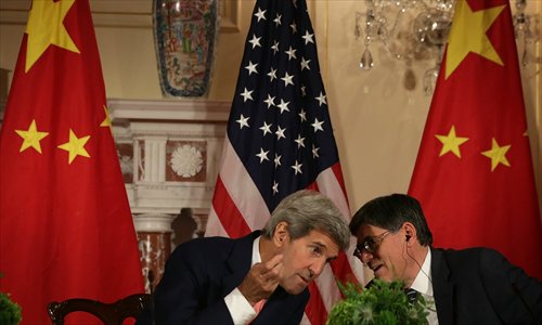 US Secretary of the Treasury Jacob Lew whispers to US Secretary of State John Kerry on Wednesday at the Department of State in Washington, DC. Officials from the US and China participated in the seventh annual China-US Strategic and Economic Dialogue to discuss bilateral issues. Photo: AFP