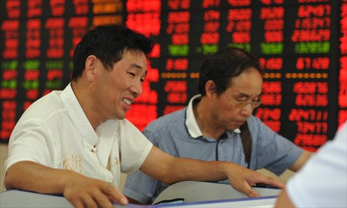 Investors check stock information at a brokerage in Fuyang, East China's Anhui Province. Photo: CFP