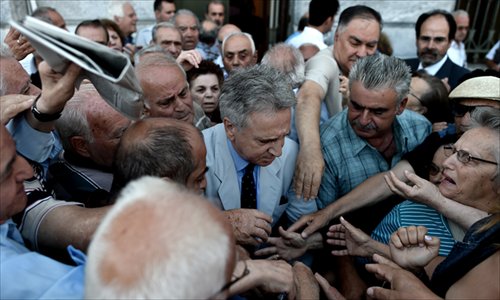 The manager of a national Bank branch delivers priority numbers to pensioners, as banks only opened for the retired to allow them to cash up to 120 euros in Athens on Wednesday. Greece on Tuesday failed to make a 1.5 billion euro ($1.7 billion) payment to the International Monetary Fund, becoming the first industrialized country to do so. Photo: AFP