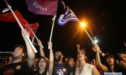 Supporters of the No vote react after the first result of the referendum at Syntagma square in Athens, Sunday, July 5, 2015. NO led by 61.3 percent of votes against 39 percent for YES in the ballot that could determine whether Greece will head to a disorderly bankruptcy and possible Grexit, according to the latest official estimate released by the Interior Ministry with about 61.3 percent of votes counted. Photo:Xinhua