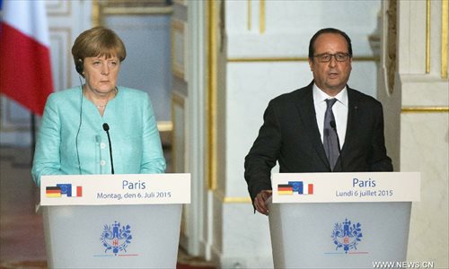 German ChancellorAngela Merkel(L) and French PresidentFrancois Hollandeattend a joint statement after their meeting at the Elysee Palace in Paris,France, on June 6, 2015. "The door remains open for discussions," declared Monday French President Francois Hollande and German Chancellor Angela Merkel in Paris, after a meeting held following Greek voters rejected creditors' bailout terms in a referendum Sunday. Photo: Xinhua