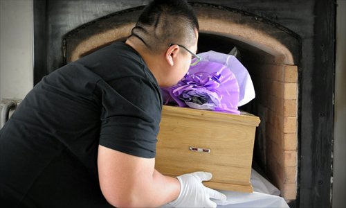 Du moves the coffin into the crematory furnace. Photo: CFP