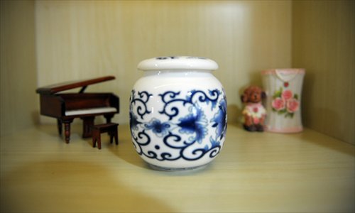 A cremation urn at the funeral home, accompanied by a miniature piano. Photo: CFP
