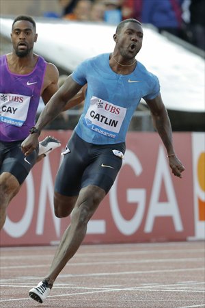 Justin Gatlin celebrates after winning the men's 100 meters event at the IAAF Diamond League meeting in Lausanne, Switzerland on Thursday Photo: IC