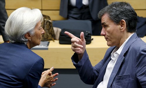 International Monetary Fund Managing Director Christine Lagarde listens to Greek Finance Minister Euclid Tsakalotos during a eurozone finance ministers meeting in Brussels, Belgium, on Sunday. Photo: AFP