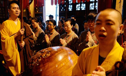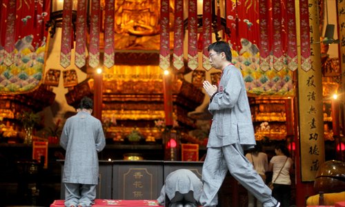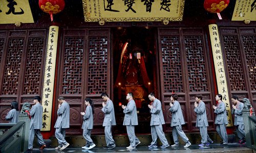 Participants line up in front of the grand hall at Shanghai's Yufo Tempo, putting their palms together. Photo: Yang Hui/GT