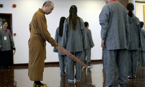 A monk teaches participants the correct posture for paoxiang, or "walking meditation," a type of meditation which involves several monks, nuns, or lay people walking in carefully coordinated sequence. Photo: Yang Hui/GT