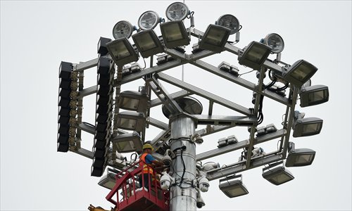 Workers make adjustments to surveillance cameras on a lighting pole in Tiananmen Square in Beijing on Thursday. The square is being prepared for a massive military parade on September 3 to mark the 70th anniversary of the end of China's War of Resistance against Japanese Aggression (1937-45). Photo: AFP