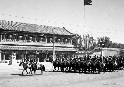 The file photo taken in 1952 shows soldiers of the Chinese People's Liberation Army(PLA) cavalry unit attending a parade to celebrate the 3rd anniversary of the founding of the People's Republic of China in Beijing, captial of China. China will hold a parade on Sept. 3, 2015 to commemorate the 70th anniversary of the victory in the Chinese People's War of Resistance against Japanese Aggression and the victory of World's Anti-Fascist War. (Xinhua)