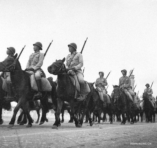 The file photo taken in 1949 shows soldiers of the Chinese People's Liberation Army (PLA) cavalry unit attending a parade to celebrate the founding of the People's Republic of China in Beijing, captial of China. China will hold a parade on Sept. 3, 2015 to commemorate the 70th anniversary of the victory in the Chinese People's War of Resistance against Japanese Aggression and the victory of World's Anti-Fascist War. (Xinhua)
