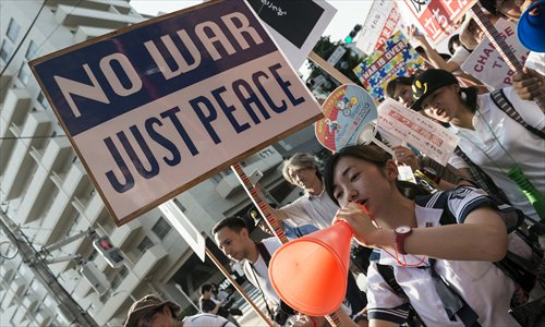 Students protest in the streets of Shibuya, Tokyo on Sunday, against what they call the "war bill," - Japan's new defense bill, and the revision of article 9 of the constitution, which together will allow overseas operations by the Self-Defense Forces, a major change to Japan's post-war defense-oriented security policy. Photo: CFP
