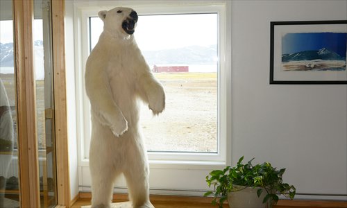 A stuffed polar bear stands in the scientific base of Ny-Alesund in the Svalbard archipelago on July 23. Photo: AFP