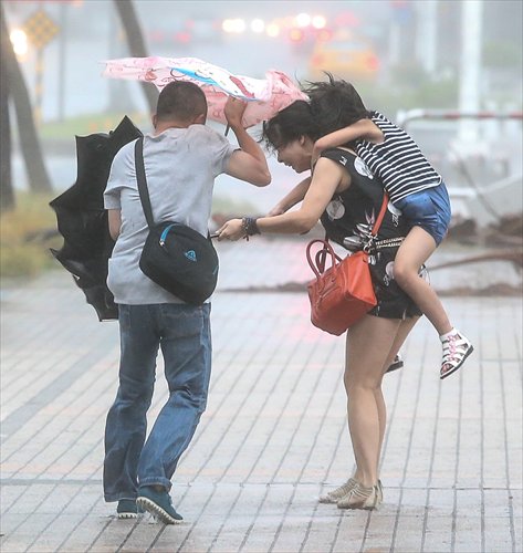 A family stands against strong winds in Kaohsiung, southern Taiwan on Saturday as Typhoon Soudelor swept across the island with winds of up to 160 kilometers per hour. Typhoon Soudelor moved further inland to Zhejiang and Fujian provinces on Saturday and Sunday. More than a dozen people have died. Photo: CFP