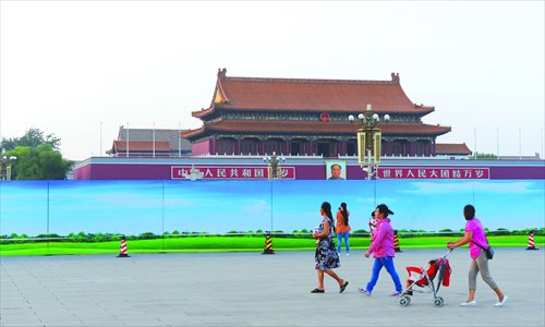 Electronic screens are installed on Saturday in Tiananmen Square for the military parade to commemorate the 70th anniversary of the end of World War II in September. Photo: CFP