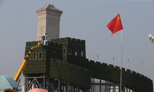 A worker decorates a Great-Wall-shaped flower bed in Tiananmen Square on Wednesday in Beijing. Flower beds of various shapes are being prepared for the upcoming military parade to celebrate the 70th anniversary of the victory of the War of Resistance against Japanese Aggression (1937-45), scheduled on September 3. Photo: CFP