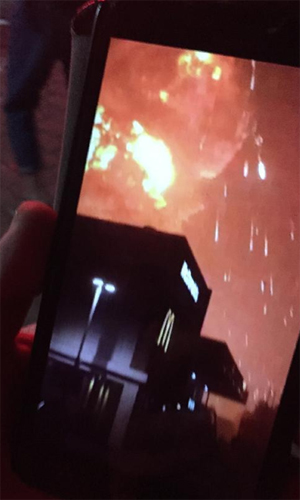 A witness shows the blast he took with his mobile phone. An explosion rocked the Binhai New Area in north China's Tianjin Municipality at around 11:30 pm Wednesday. The cause and casualties are not immediately known. Photo: Xinhua