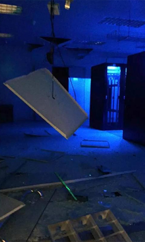 Shattered windows of a nearby building are seen after an explosion in the Binhai New Area in north China's Tianjin Municipality on Aug. 13, 2015. An explosion rocked the Binhai New Area in north China's Tianjin Municipality at around 11:30 pm Wednesday. The cause and casualties are not immediately known. Photo: Xinhua