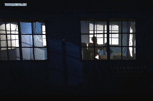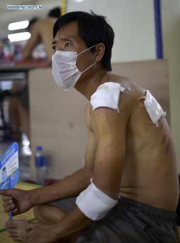 An injured rests at a temporary shelter in No. 2 Elementary School of the Binhai New District Development Zone in Tianjin, north China, Aug. 13, 2015. An explosion, which occurred Wednesday night at a warehouse in Binhai, has left 50 people dead and 701 others injured. (Xinhua/Yue Yuewei)