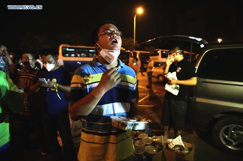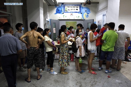People wait to register at a temporary shelter in No. 2 Elementary School of the Binhai New District Development Zone in Tianjin, north China, Aug. 13, 2015. An explosion, which occurred Wednesday night at a warehouse in Binhai, has left 50 people dead and 701 others injured. (Xinhua/Shen Bohan)