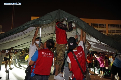 Volunteers erect tents at a temporary shelter in No. 2 Elementary School of the Binhai New District Development Zone in Tianjin, north China, Aug. 13, 2015. An explosion, which occurred Wednesday night at a warehouse in Binhai, has left 50 people dead and 701 others injured. (Xinhua/Shen Bohan)
