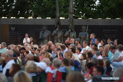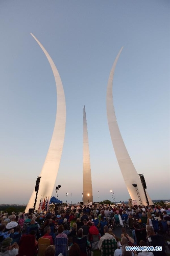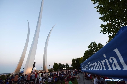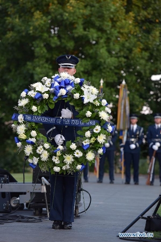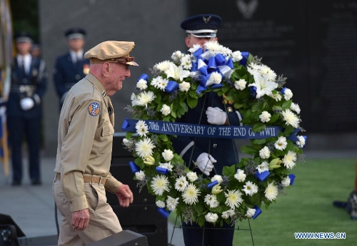 People attend a wreath-laying ceremony marking the 70th anniversary of the end of World War II at the US Air Force Memorial in Arlington, Virginia, the United States, Aug. 14, 2015. (Xinhua/Yin Bogu)