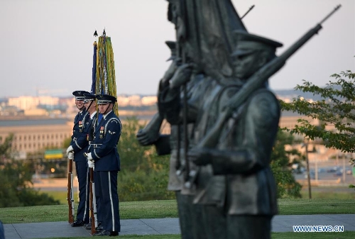Soldiers of honor guard stand during a wreath-laying ceremony marking the 70th anniversary of the end of World War II at the US Air Force Memorial in Arlington, Virginia, the United States, Aug. 14, 2015. (Xinhua/Yin Bogu)