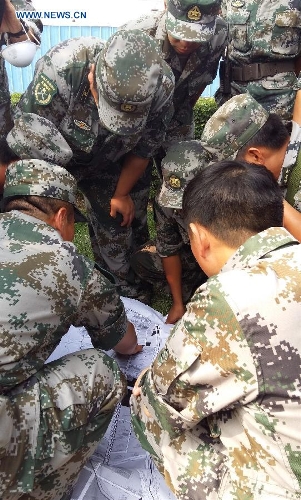 Soldiers of National Nuclear Biochemical Emergency Rescue Team prepare to launch a rescue mission at the core area of explosion site in Tianjin, north China, Aug. 15, 2015. Death toll rose to 85 as of Friday night, including 21 firemen, from the massive warehouse explosions hitting north China's Tianjin City Wednesday night, the rescue headquarters said Saturday. Meanwhile, 721 others were hospitalized, including 25 critically wounded and 33 in serious condition. (Xinhua/Xu Zhuangzhi)