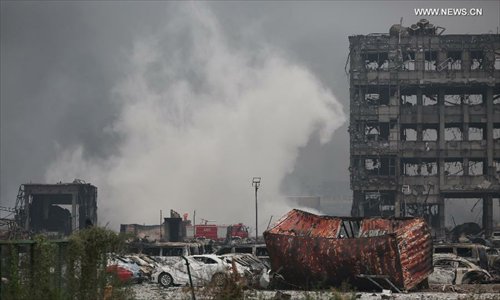 Fire fighters extinguish a fire at the warehouse explosion site in Tianjin, north China, Aug. 15, 2015. Death toll rose to 104 from the massive warehouse explosions hitting north China's Tianjin city Wednesday night, local authorities said on Saturday night. Photo: Xinhua