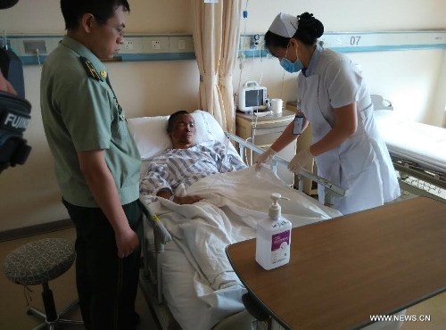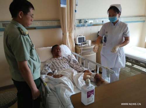 A nurse takes care of the rescued firefighter Zhou Ti in Teda Hospital in north China's Tianjin Municipality, Aug. 16, 2015. Zhou has recovered smoothly and can have slop for food on Sunday. (Xinhua/Lv Dong)