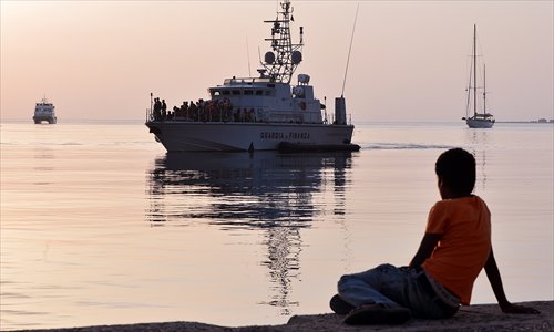A migrant boy watches an Italian Frontex vessel carrying intercepted migrants arriving to the port of Kos, Greece on Sunday. The Greek government sent a ferry to serve as a temporary center to issue travel documents to Syrian refugees. Photo: AFP