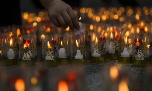 A person lights a candle during a mourning ceremony in front of Teda Hospital in Tianjin on Tuesday, the seventh day after the deadly explosions and a day on which Chinese people believe the deceased's souls will come home. Photo: CFP