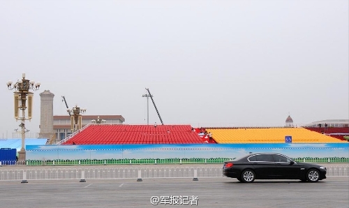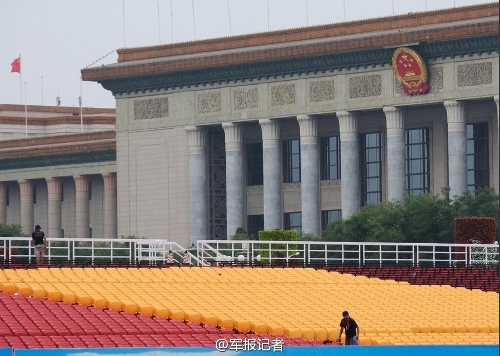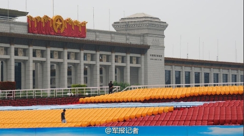 Photo taken on August 18, 2015 shows the military parade reviewing stands set in front of the Tian'anmen Square in Beijing, capital of China. Preparation is being made for the military parade marking the 70th anniversary of the victory in the Chinese People's War of Resistance against Japanese Aggression on September 3. Photo: PLA Daily