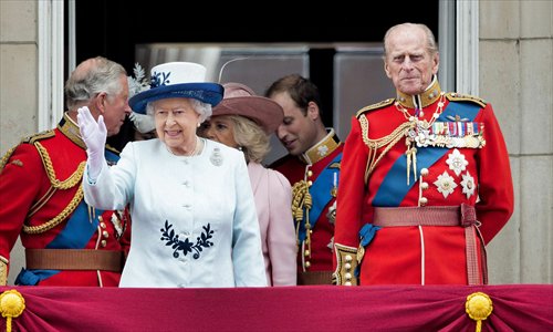 Queen Elizabeth II and Prince Philip watch the trooping of the colors, in London, Britain. Photo: IC
