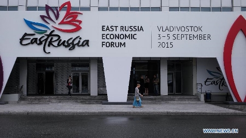 A woman walks past the main site of the 2015 Eastern Economic Forum in Russia's Far East city Vladivostok, on Aug. 25, 2015. The 2015 Eastern Economic Forum (EEF) will kick off on Sept 3, 2015. The EEF was established in compliance with a decree issued by Russian President Vladimier Putin in May 2015. According to the decree, the EEF takes place annually in Vladivostok. (Xinhua/Dai Tianfang)